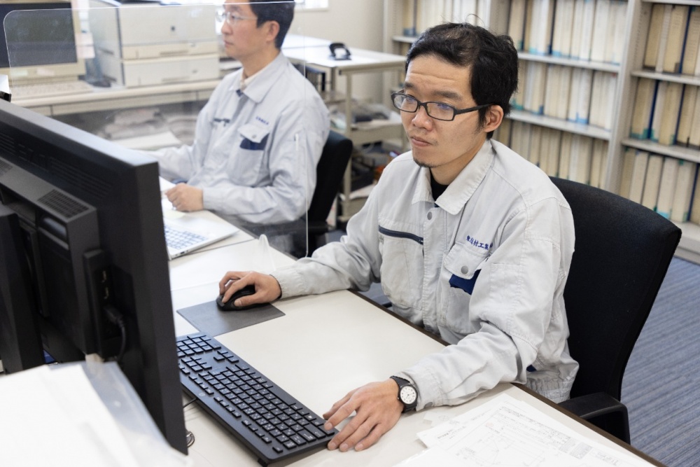 高い生産性や品質のモノづくりが実現できるよう、様々な技術領域で生産現場をサポートするのが技術グループのミッション。具体的にはマシンのプログラミング、生産工程・操業の改善、品質の管理・検査などを行います。ちょっとカッコよく言うと、現場を支える技術ブレーン=頭脳といったところでしょうか。私は、その中でも穴あけ加工における品質管理・検査を担当しています。基本的にはオフィスで業務を行いますが、工場にも頻繁に足を運びます。製造・加工スタッフとは密にコミュニケーション。作業内容についてすり合わせを行いながら「要領が悪いところないか?」「見落とししやすいポイントないか?」「お客様に迷惑がかかるところはないか?」など、様々な観点から作業の詳細を確認して、製品に不良が出ないよう未然防止を行います。
